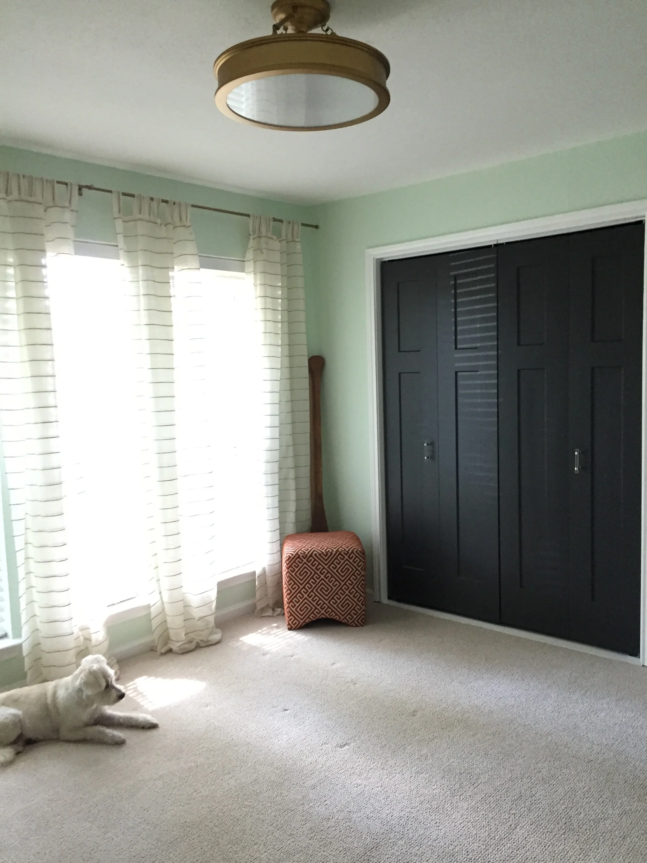 Enter our music room/man cave/sorta guest room/sorta office. This room has been a weird space from day 1. I had originally intended for it to be Charlie's music room/man cave, but he literally never used it. We occasionally needed an extra room for guests so we slapped this sofa bed in there. Once it was in the room I instantly regretted my purchase, but salvaged it by throwing a blanket over it. Then I got the idea to turn this room into my office since it receives a ton of natural light. We ripped out the old closet shelves, installed a new storage system for my office supplies, and then never touched it again until very recently when we removed the sliding mirrored doors and put in bifold doors. I'm determined to finally turn this into a usable room, so I sold a lot of the furniture and this is how it looks today: