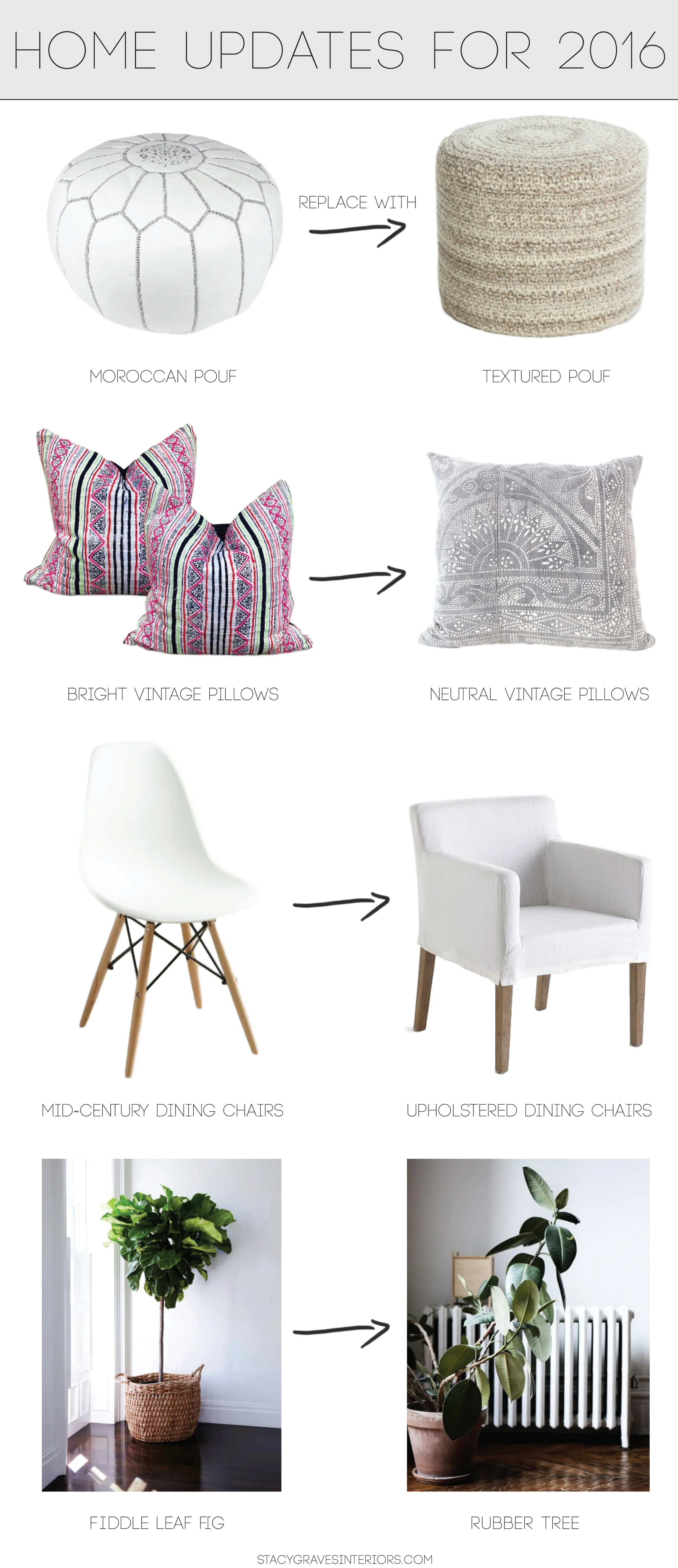 In the last few years everyone went wild for moroccan poufs, bright Hmong pillows, eiffel chairs, and fiddle leaf figs, so today I'm sharing a few suggestions to freshen up these items for 2016. I'll be the first to admit that I have every one of these items in my own home, and if you have them in yours I'm not insisting that you should to switch them out, but if you're anything like me you need to change it up a little every now and then to keep it fresh.
