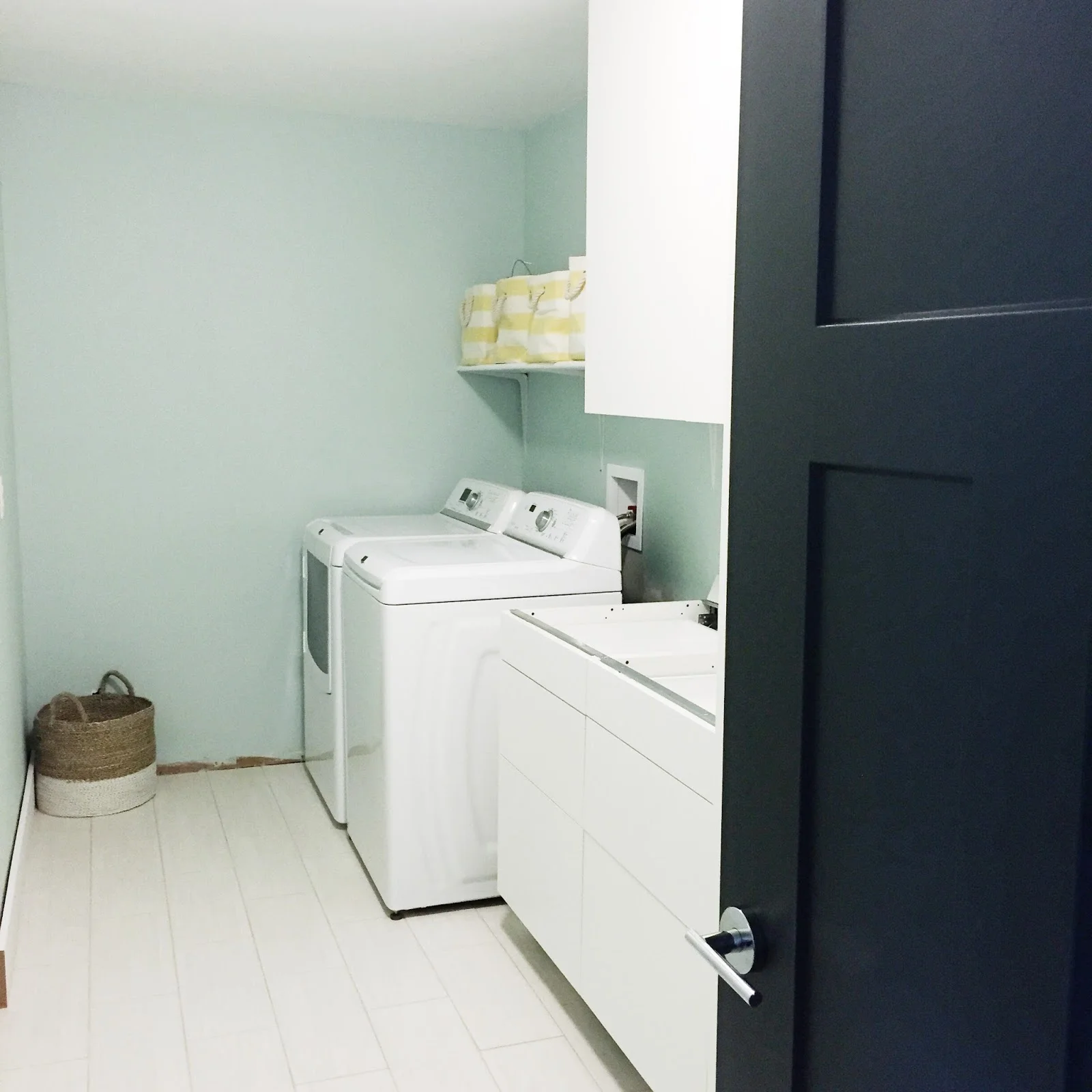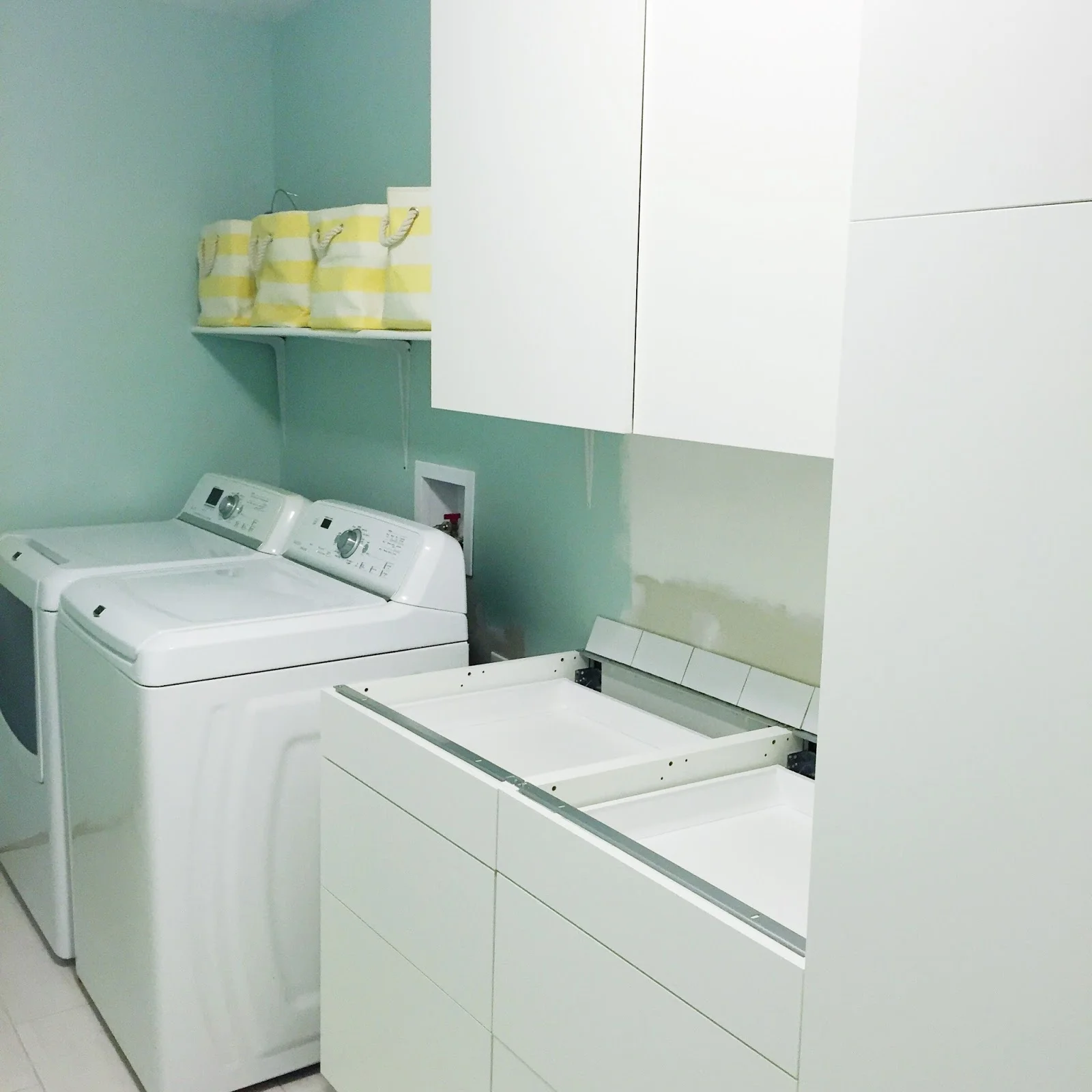 We will lower the shelf above the washer and dryer once we tile the backsplash, which we've decided to extend along the back wall (thank you for your input last week!). It looks a little plain now, but once the countertops, backsplash, new hardware, and accessories are installed, it will add much needed texture.