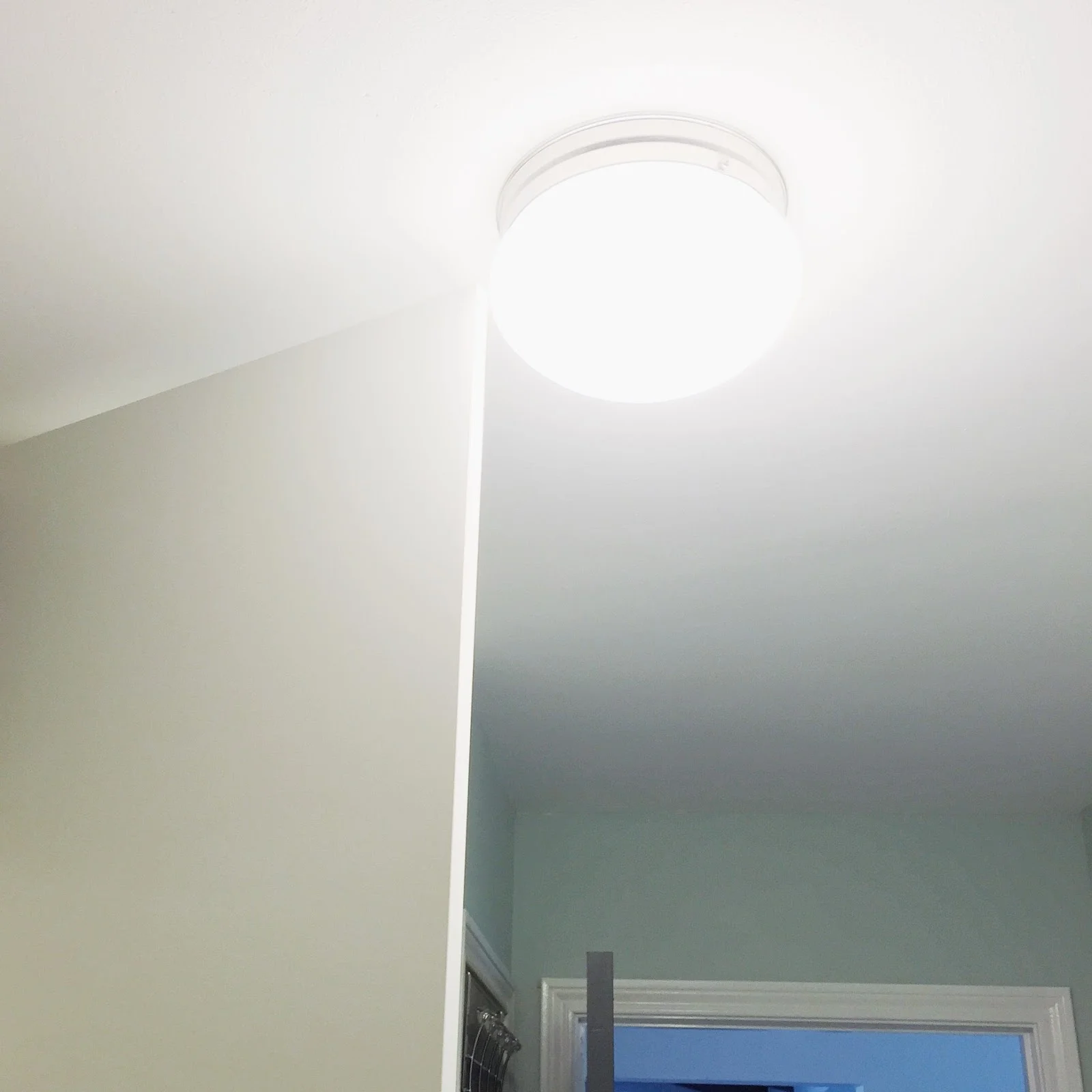 I'm still on the fence about my light fixture situation. The cabinet doors clear our current light by less than 1/2", which makes me a little nervous about my light fixture choice. Right now, moving it isn't an option because we just recently had the walls and ceiling skim coated and I really don't want to mess with repairing the ceiling myself. If the light fixture I chose doesn't work, my plans are to use it in our hallway and convert this to recessed lighting for now. Stay tuned for how this pans out!