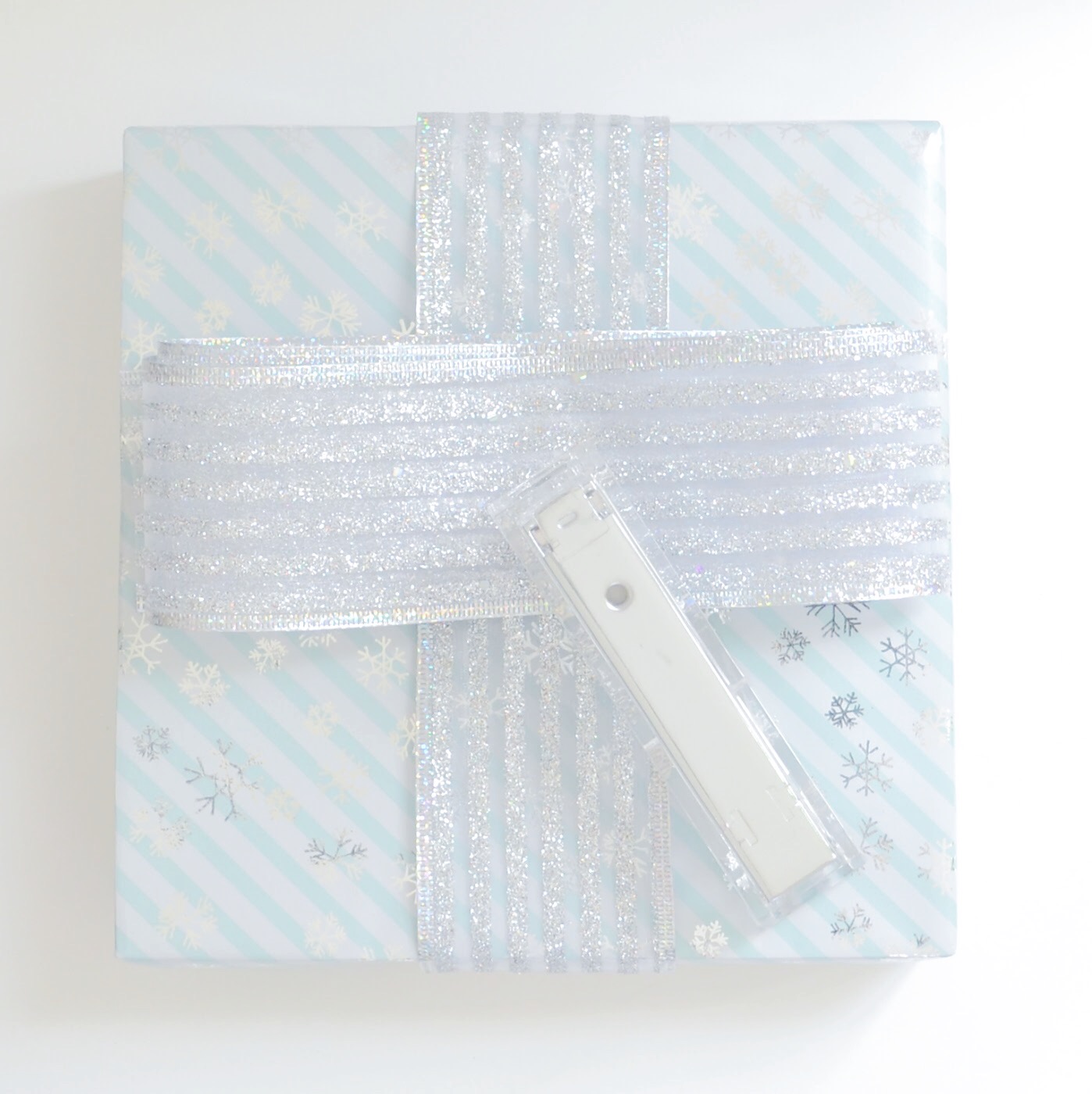 7 | Place your folded ribbon perpendicular the ribbon you placed on the package and staple once to hold in place.