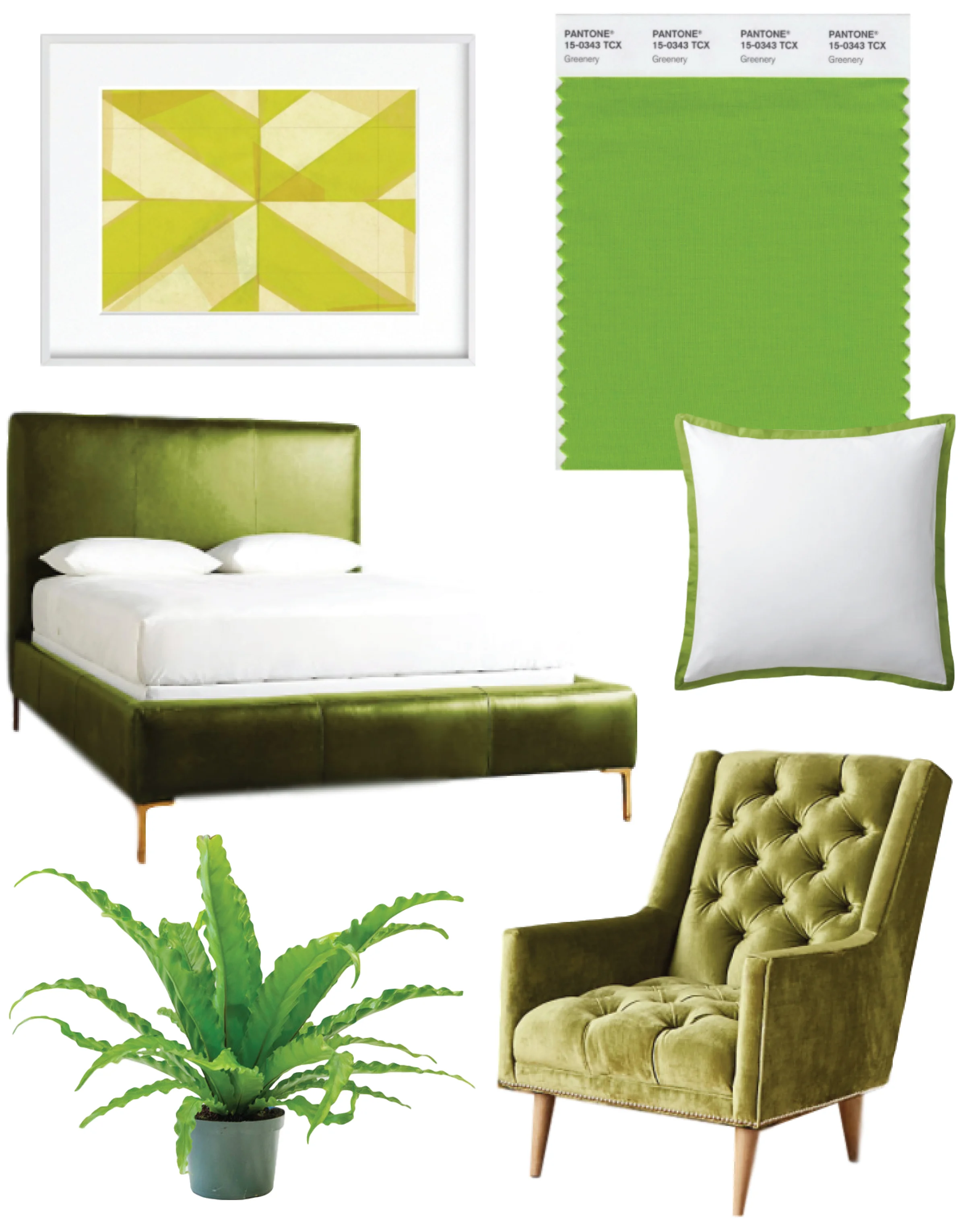 Clockwise left to right: artwork | pantone greenery swatch | euro sham | slub velvet chair | bird's nest fern | green leather edlyn bed