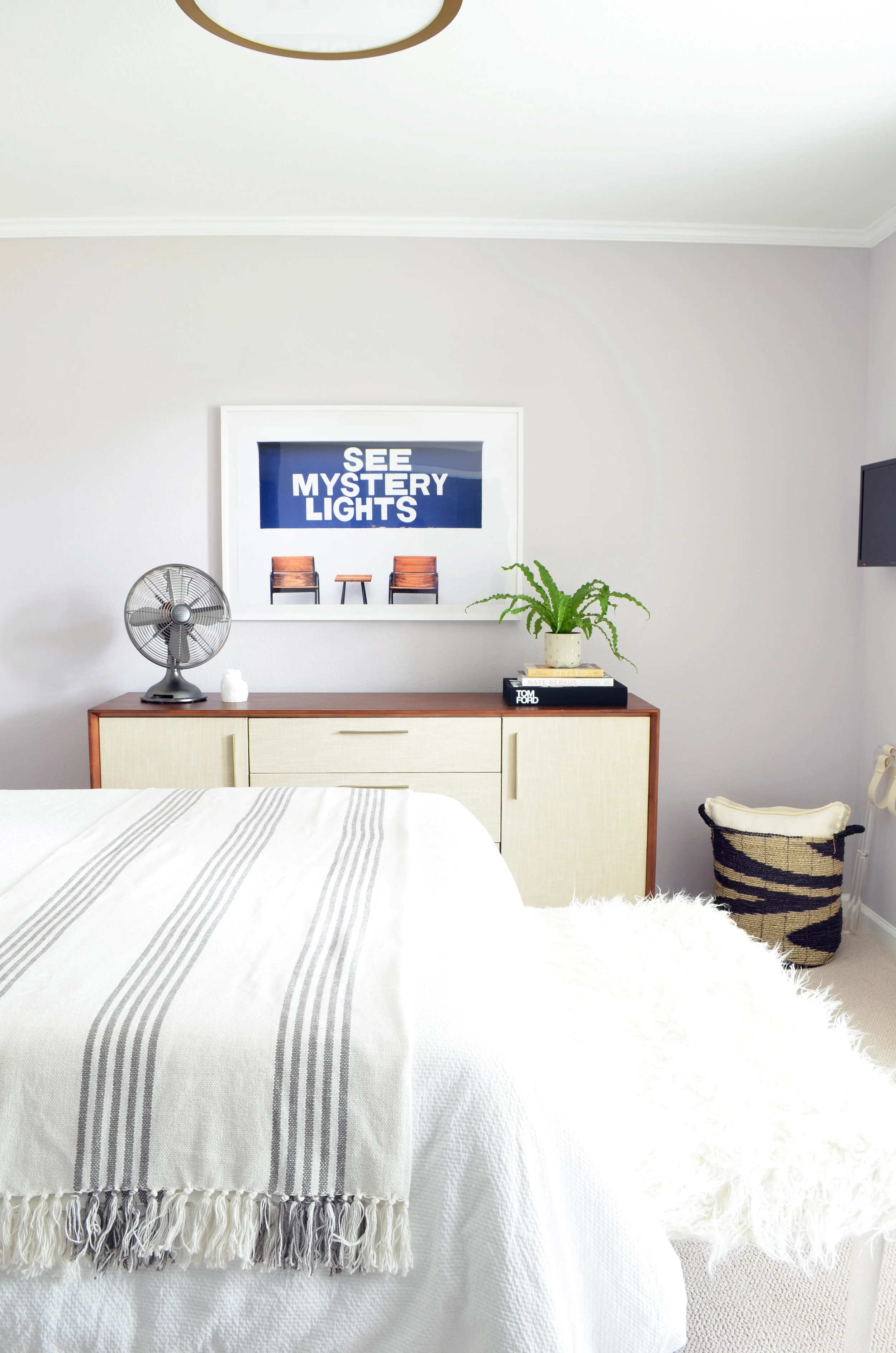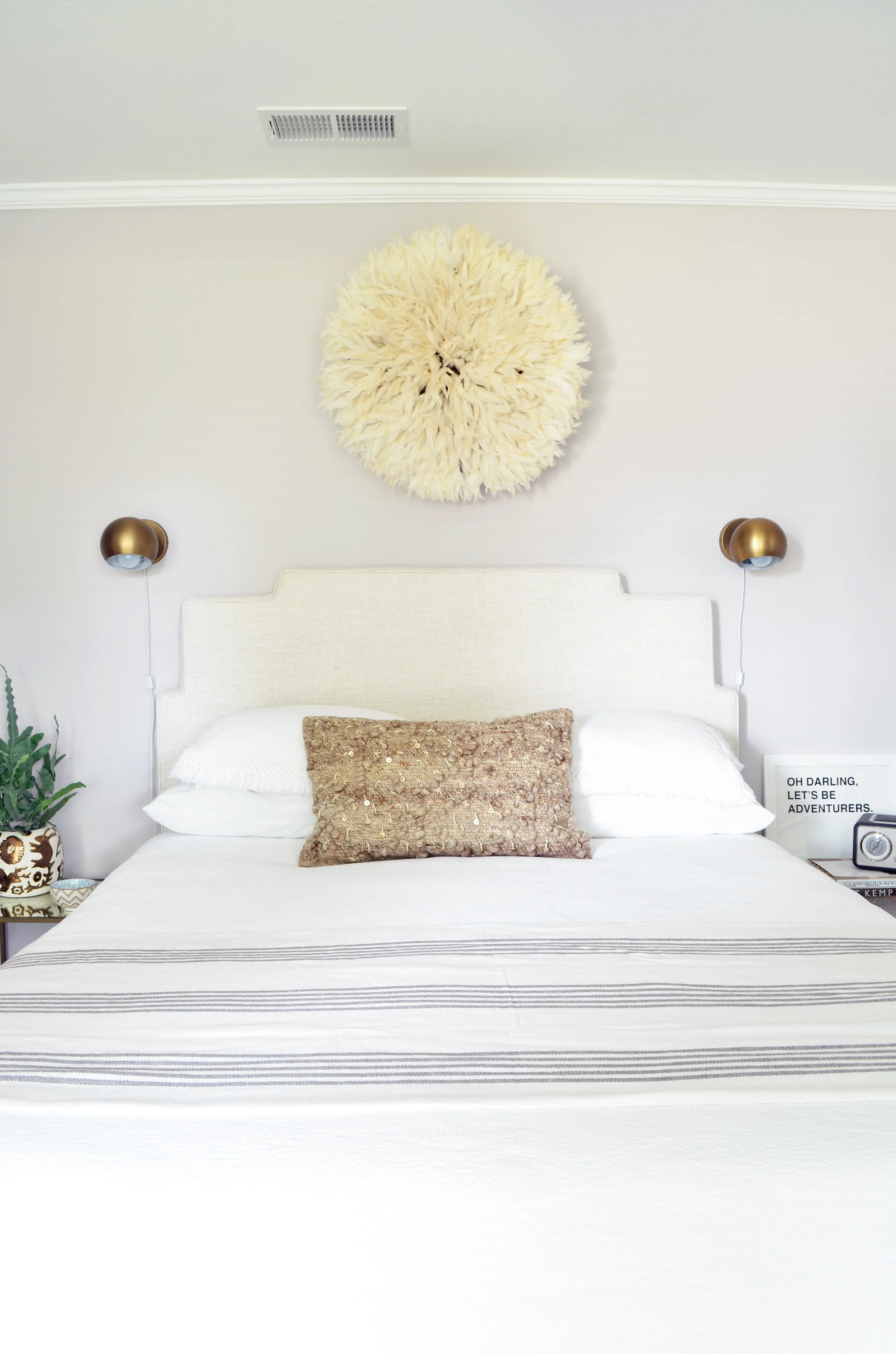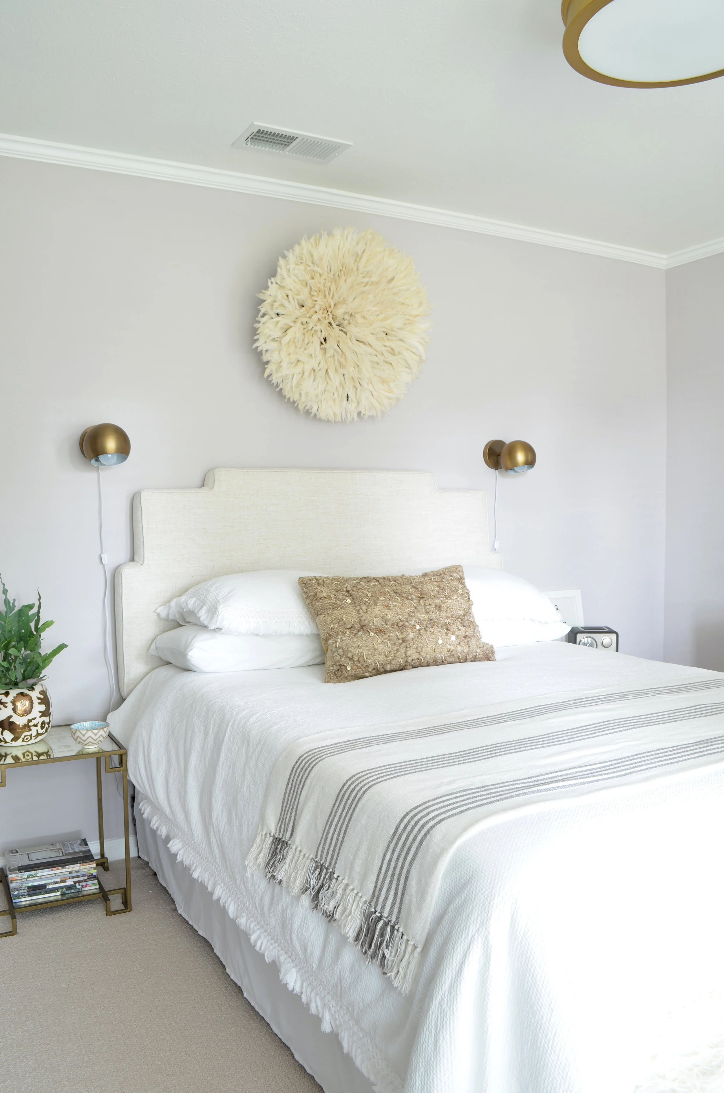 Sources: Headboard | Duvet | Throw | Lumbar Pillow, no longer available (similar) | Acrylic Side Table, no longer available (similar) | Gold Side Table, no longer available (similar) | Planter | Sconces | Juju Hat | Faux Fur Lucite Bench, no longer available (similar) | Sideboard, no longer available (similar) | Drapery | Acrylic Armchair | Armchair Pillow | Paint Color | Closet Hardware | Light Fixture