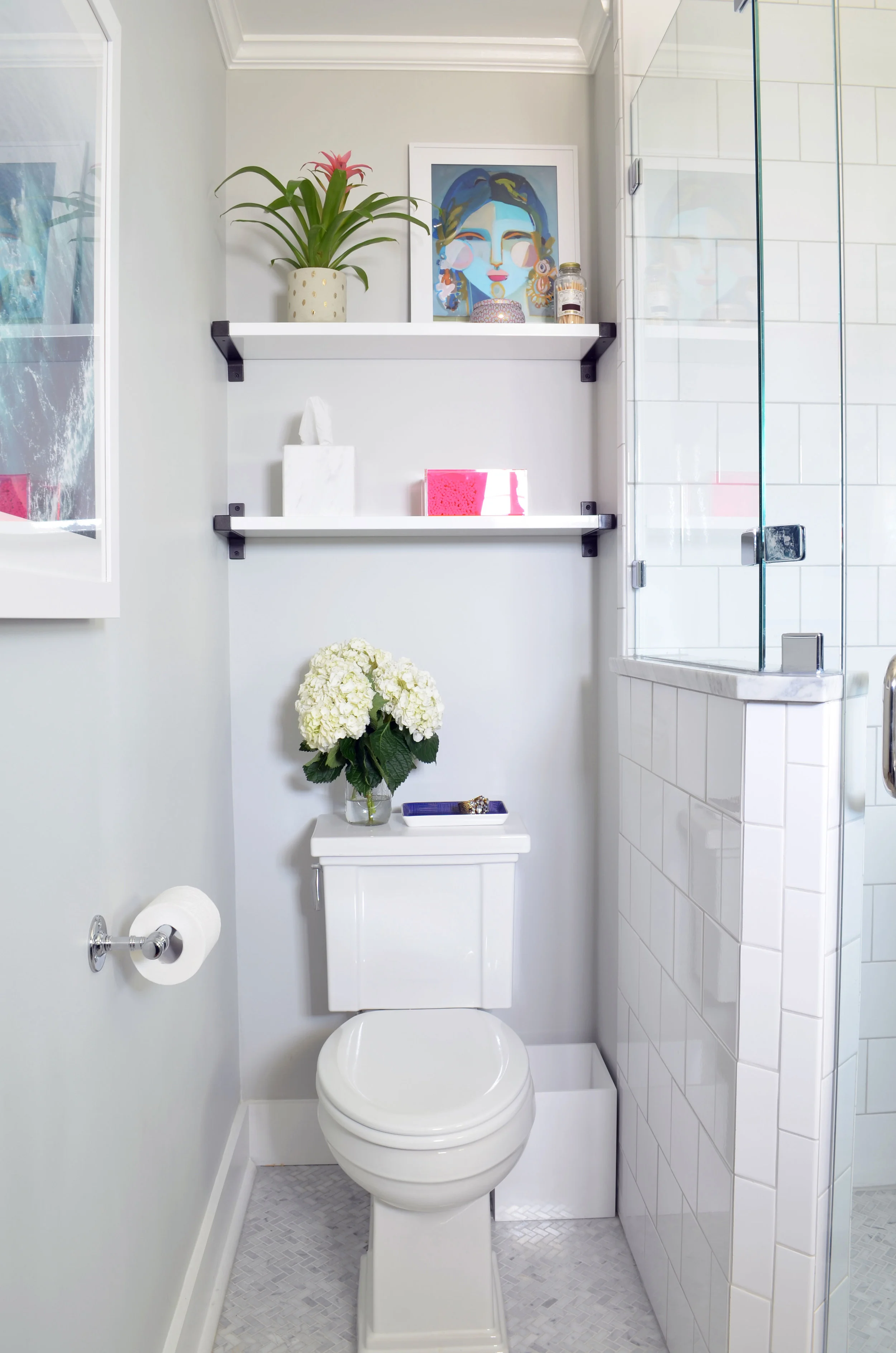 We removed the cabinet above the toilet, added open shelving, and replaced the toilet.