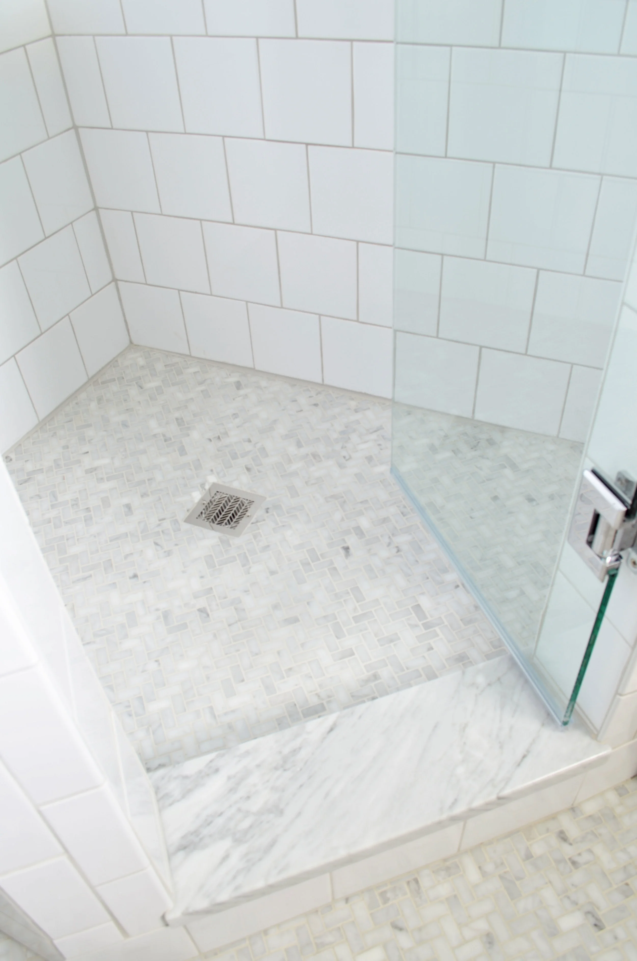 When we framed out the new shower we were able to make a slightly larger door opening, and we gained about one inch on each side of the shower which makes a huge difference in such a small space. We also replaced the rough-in drain so we could use this square drain cover that tied into the herringbone pattern in our tile.